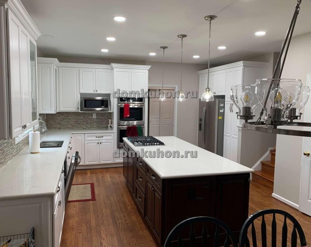 Вашему вниманию представляется кухонный гарнитур "Мадрид" — истинное воплощение элегантности и удобства. Благородный белый цвет фасадов в сочетании с теплым оттенком дерева островной столешницы придают интерьеру легкость и свежесть. Изящные стеклянные подвесные светильники идеально дополняют классический дизайн, создавая уютную атмосферу. Практичность каждого шкафа и продуманность конструкции обеспечивают максимальную функциональность пространства. Кухня "Мадрид" — это не просто место для приготовления пищи, это сердце вашего дома, где каждая деталь говорит о заботе и комфорте. Выбирая "Мадрид", вы выбираете безупречный стиль и качество.